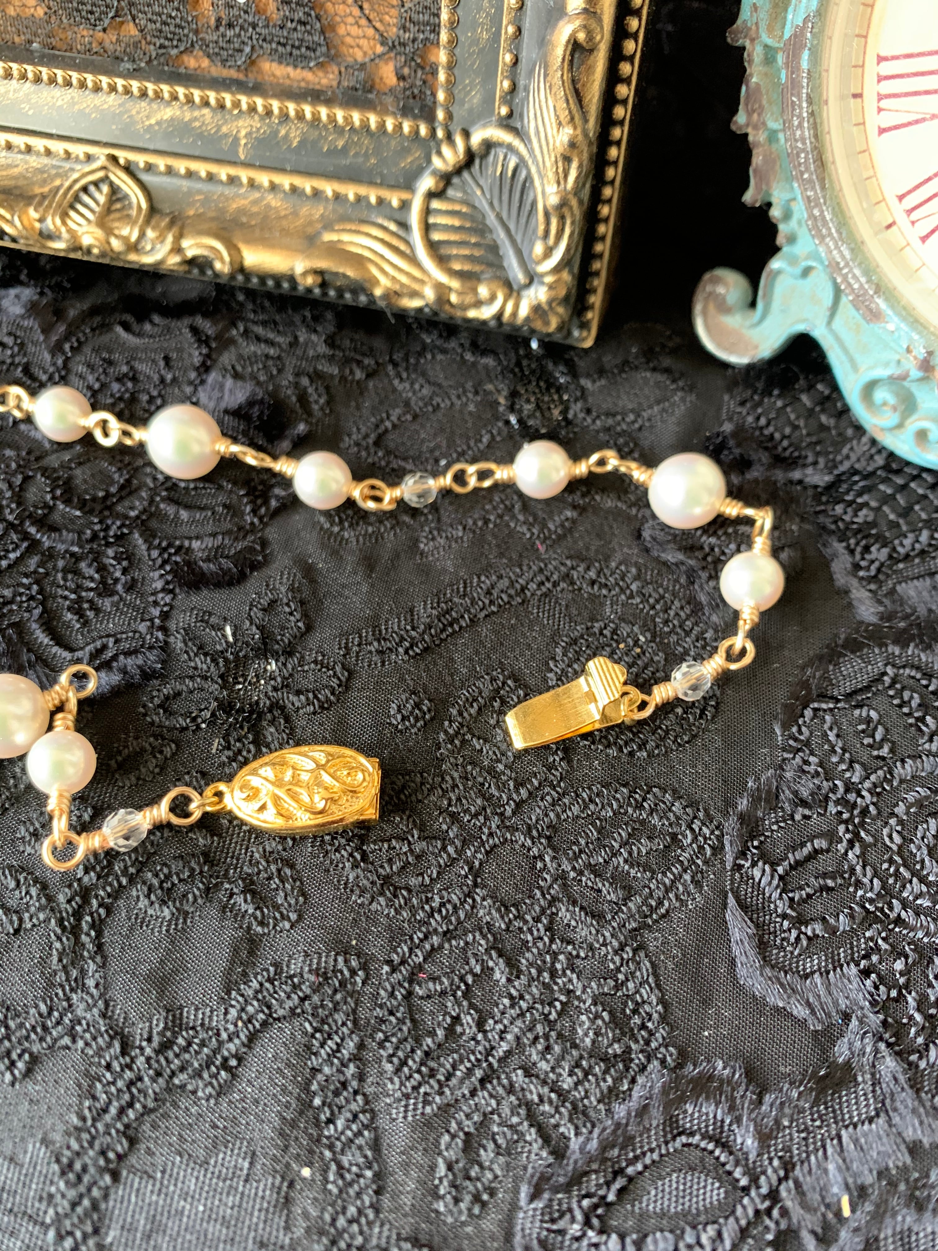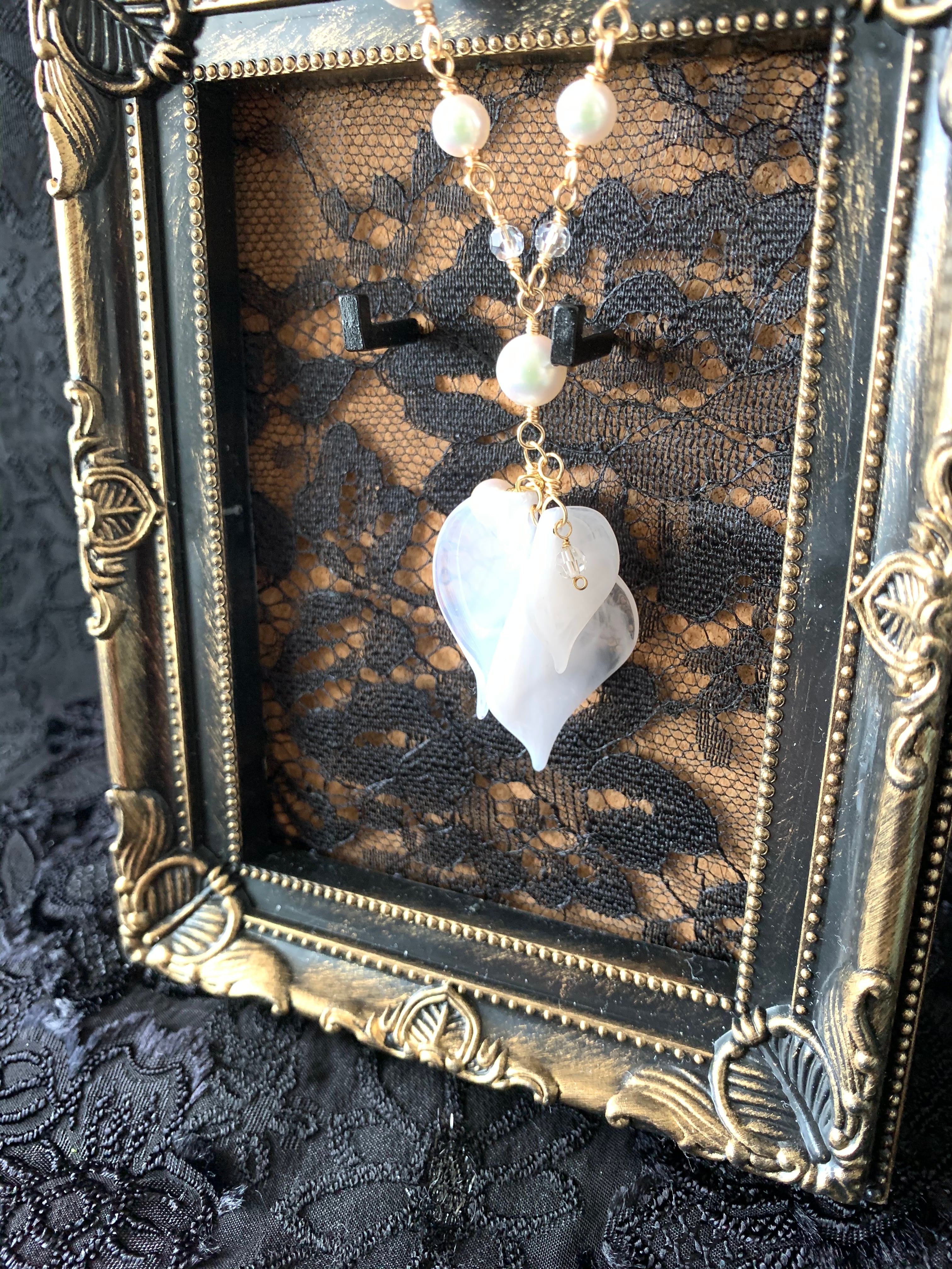 ※ 長さは約41㎝ ※ 飾りの長さは約5㎝ ※ 留め具は取り外ししやすい差し込み式クラスプ ※ パールビーズはヴィンテージビーズ ※ リーフ形パーツはアクリル